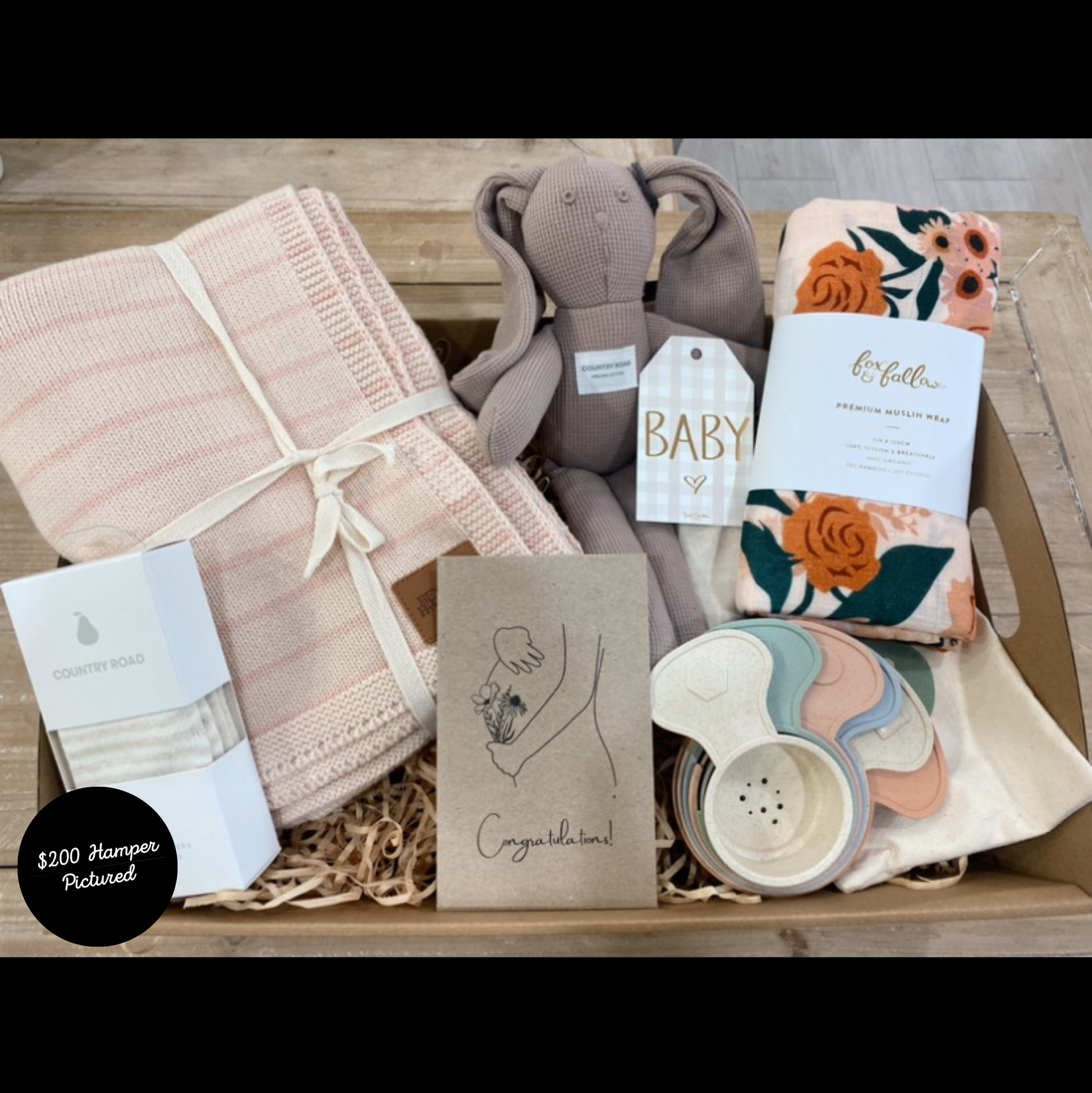 A mixed hamper full of gorgeous baby items to welcome a new Bub into the world.
