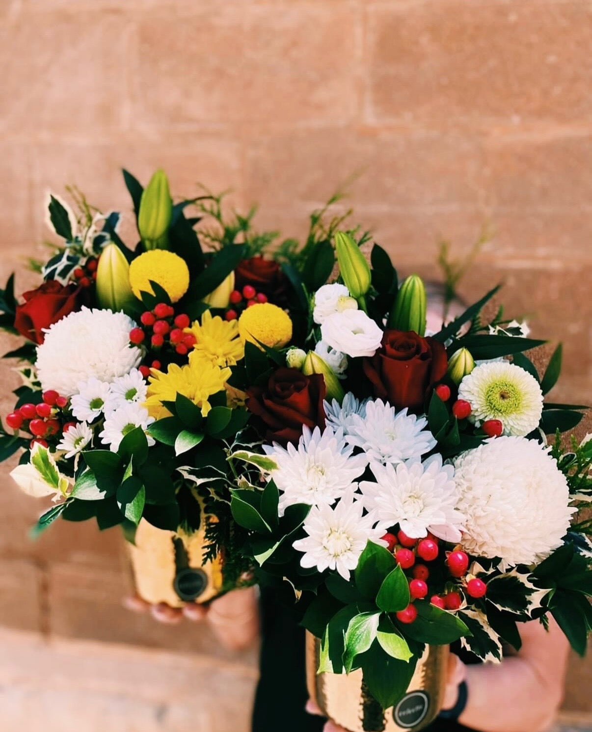 A beautiful mix of seasonal blooms in a green ceramic pot, featuring tones of festive Red, White and Green.